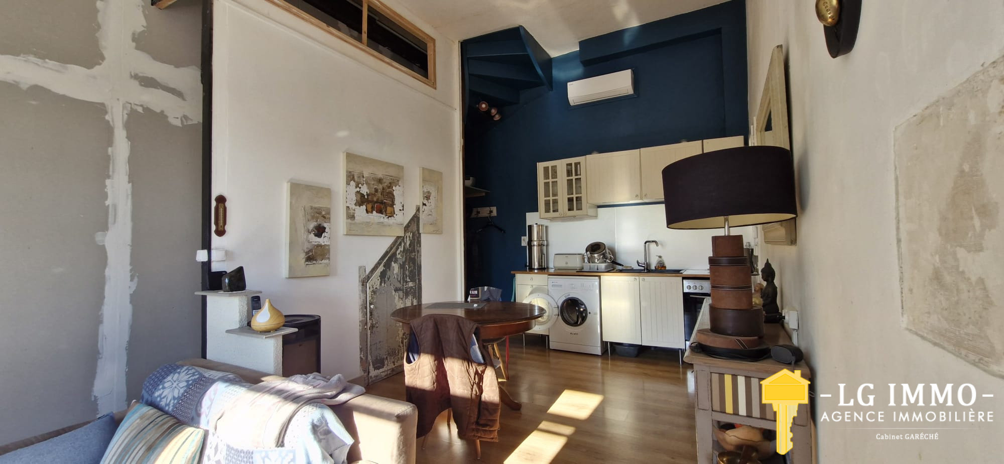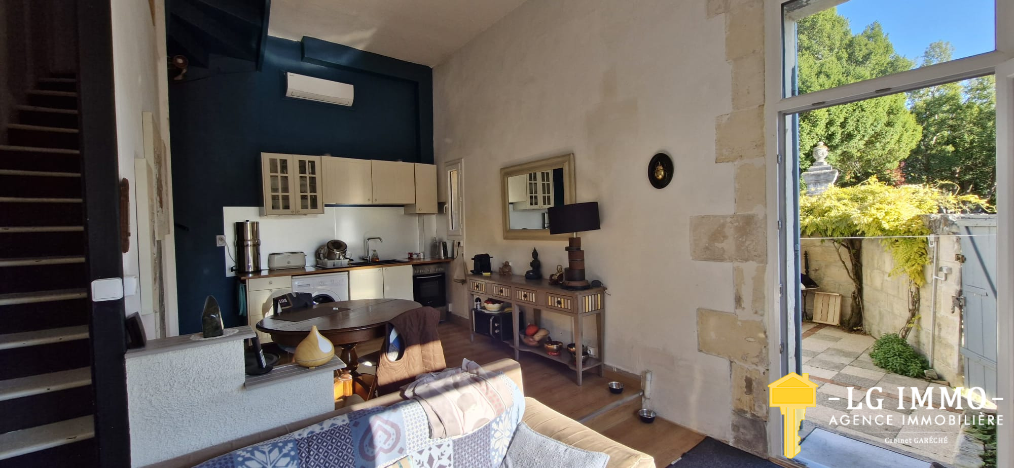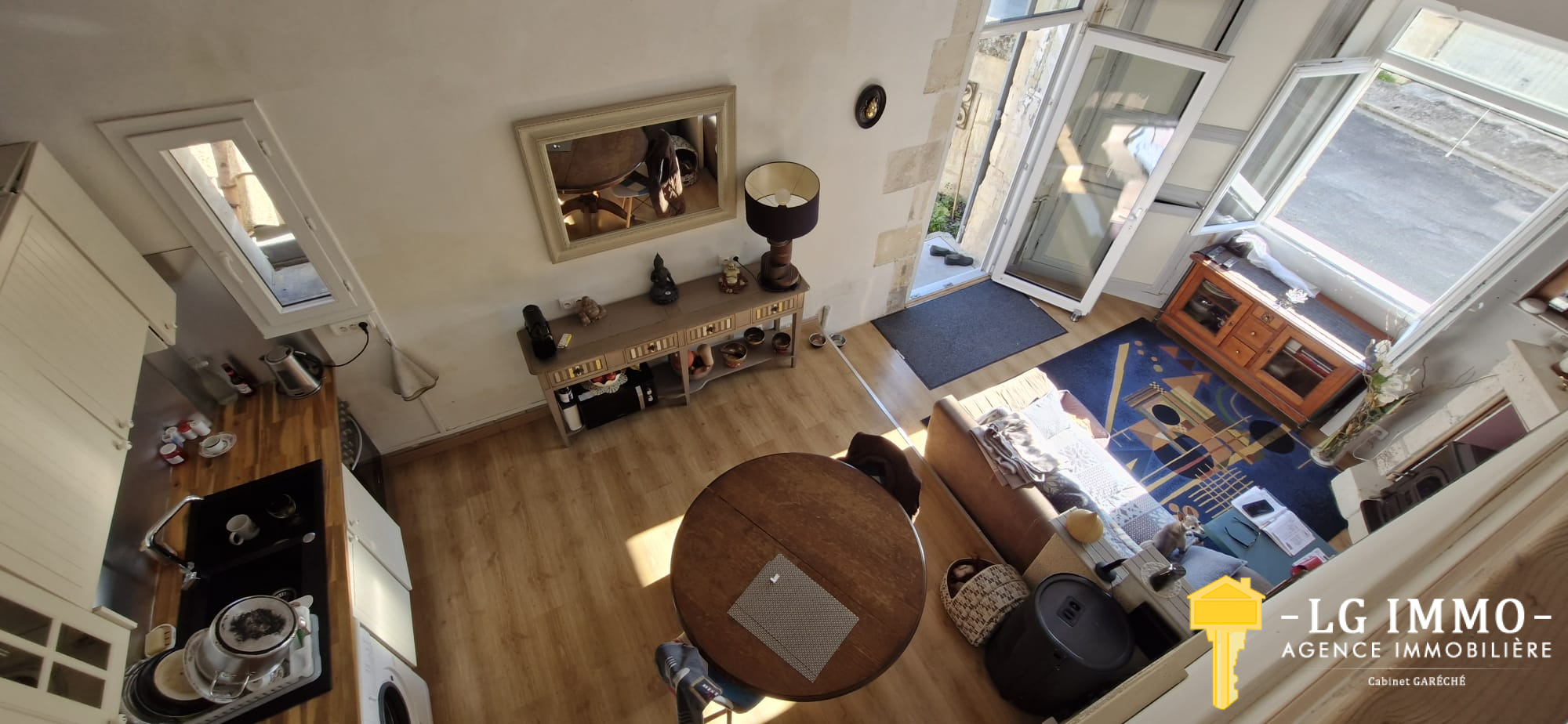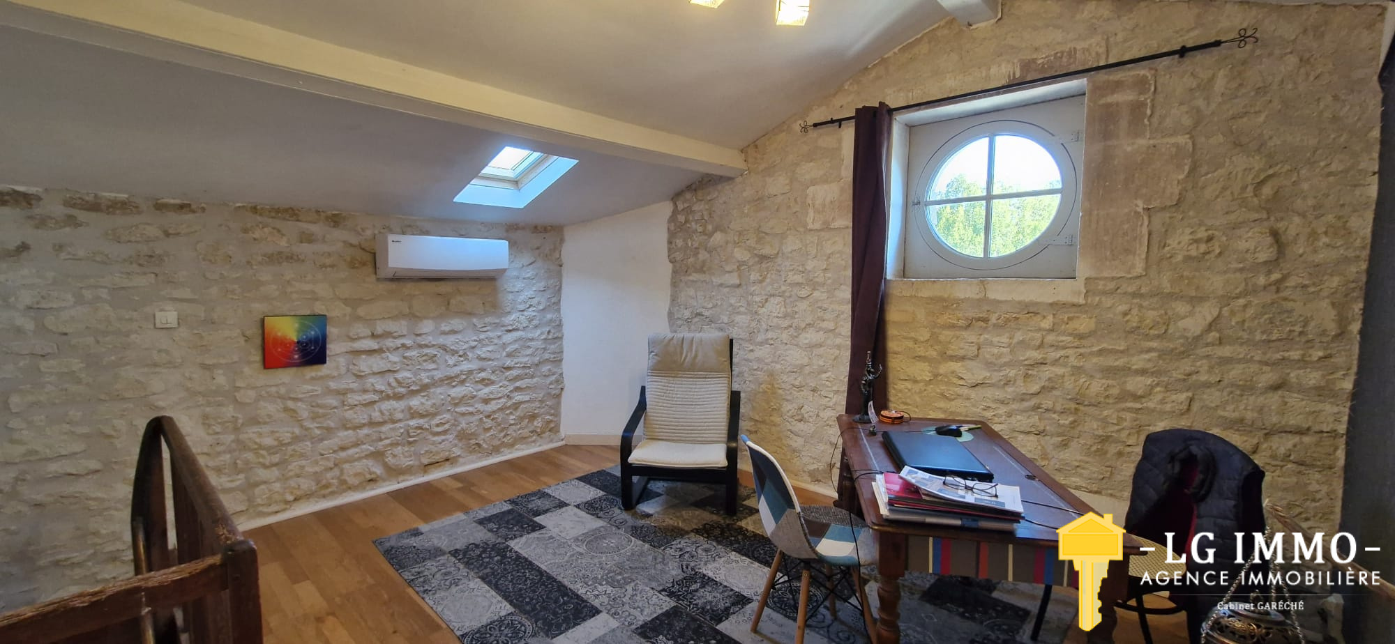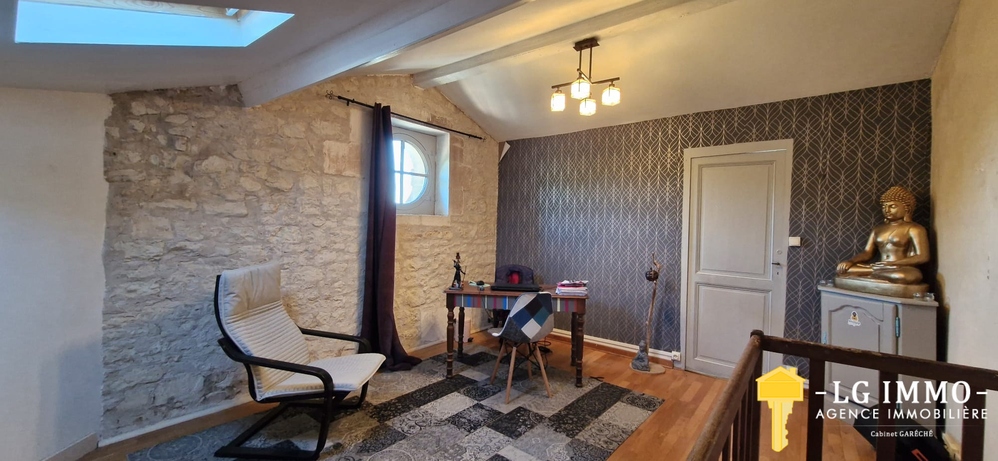 Maison de ville en pierre comprenant un salon/séjour avec poêle à bois et cuisine ouverte au rez-de-chaussée. Au premier étage, un palier dessert une chambre et une salle d'eau avec WC. Le deuxième étage abrite une seconde chambre très lumineuse ainsi qu'une pièce en partie mansardée utilisée comme dressing. La maison est chauffée par une climatisation réversible ainsi qu'un poêle à bois récent. L'isolation à été revue (murs et menuiseries).