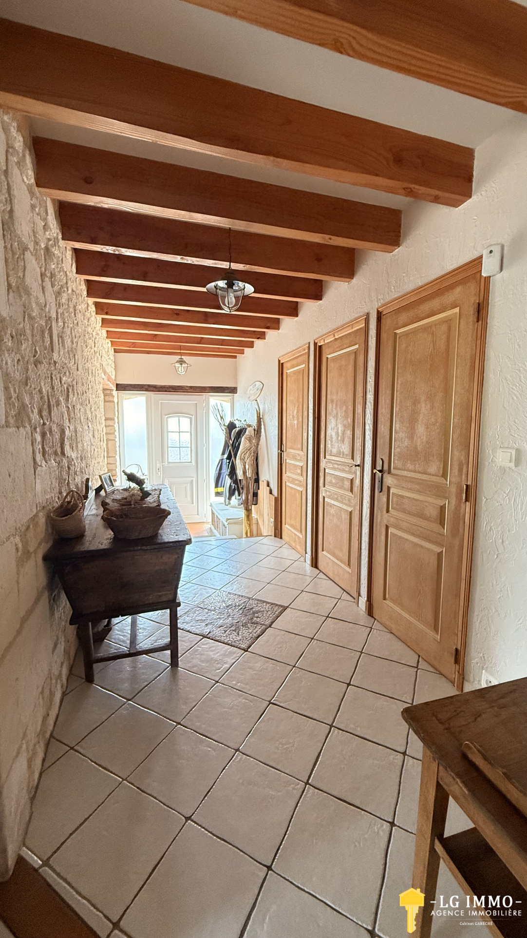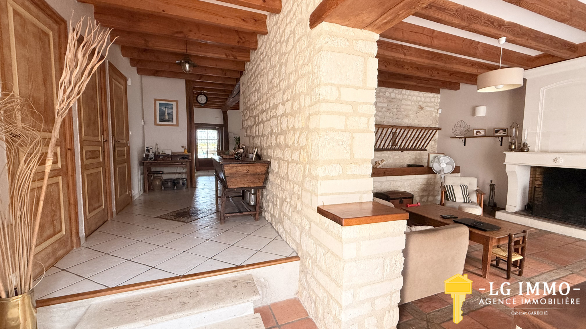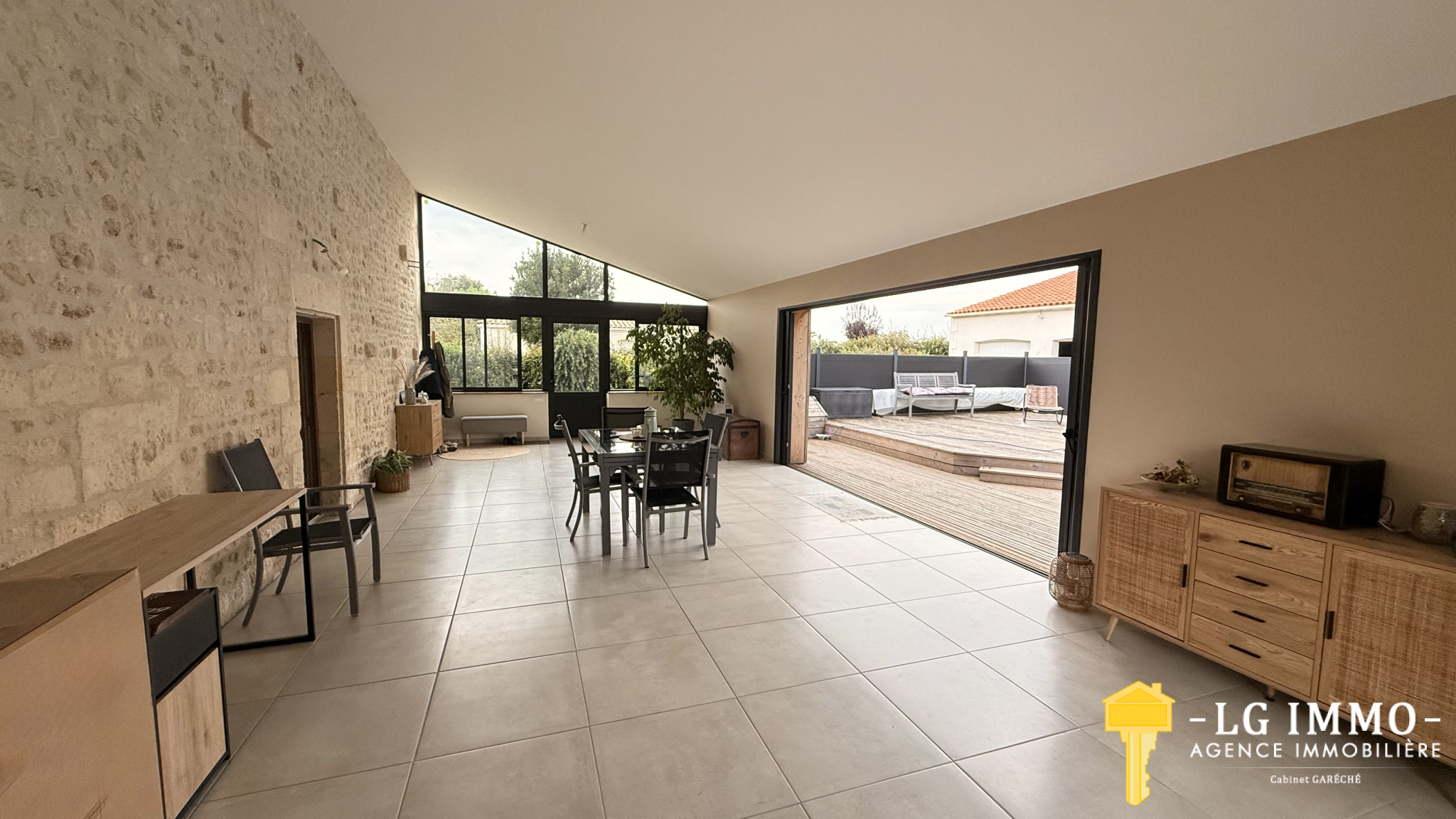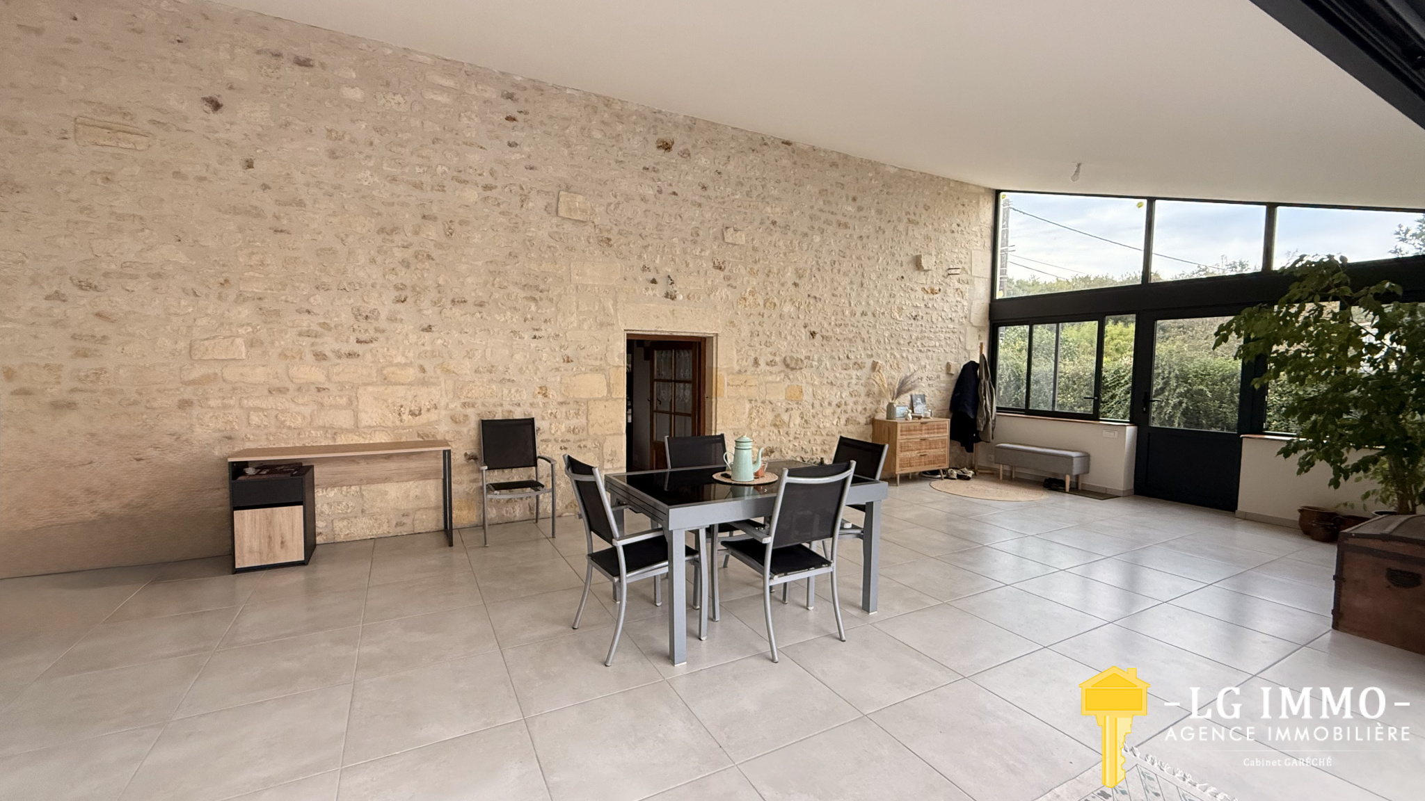 Laissez-vous séduire par le charme de cette authentique maison charentaise en pierre de 220m², idéalement située dans un paisible hameau de Tesson, face à la campagne, tout en bénéficiant de la proximité immédiate des commodités du village. Cette demeure pleine de caractère allie cachet de l’ancien et confort actuel, et se distingue par ses beaux volumes et sa luminosité. Véritable cœur de la maison, une superbe véranda de 47 m² s’ouvre largement sur la piscine avec sa belle baie vitrée à galandage avec 4.5m d'ouverture totale, offrant un espace de vie privilégié où profiter de chaque saison en toute convivialité. vous retrouvez également une cuisine avec cellier de 17m² , une salle à manger de 27m² et un salon cosy avec cheminée de 20m². A l'étage 4 chambres spacieuses de 17 m2, 21 m2,16 m2, et 16.5 m², reste à terminer la salle d'eau. À l’extérieur, le jardin arboré invite à la détente et aux moments partagés en famille ou entre amis. Côté pratique, un vaste garage double avec atelier de 43m² et galetas de 13m² vient compléter les prestations, parfait pour stationner, bricoler ou aménager un espace supplémentaire selon vos envies. Entre charme, confort et fonctionnalité, cette maison constitue une belle opportunité pour ceux qui recherchent la tranquillité de la campagne sans renoncer aux services et commerces de proximité (boulangerie, boucherie, supérette, école, poste, restaurant, pharmacie, cabinet médical, garage, coiffeur...)