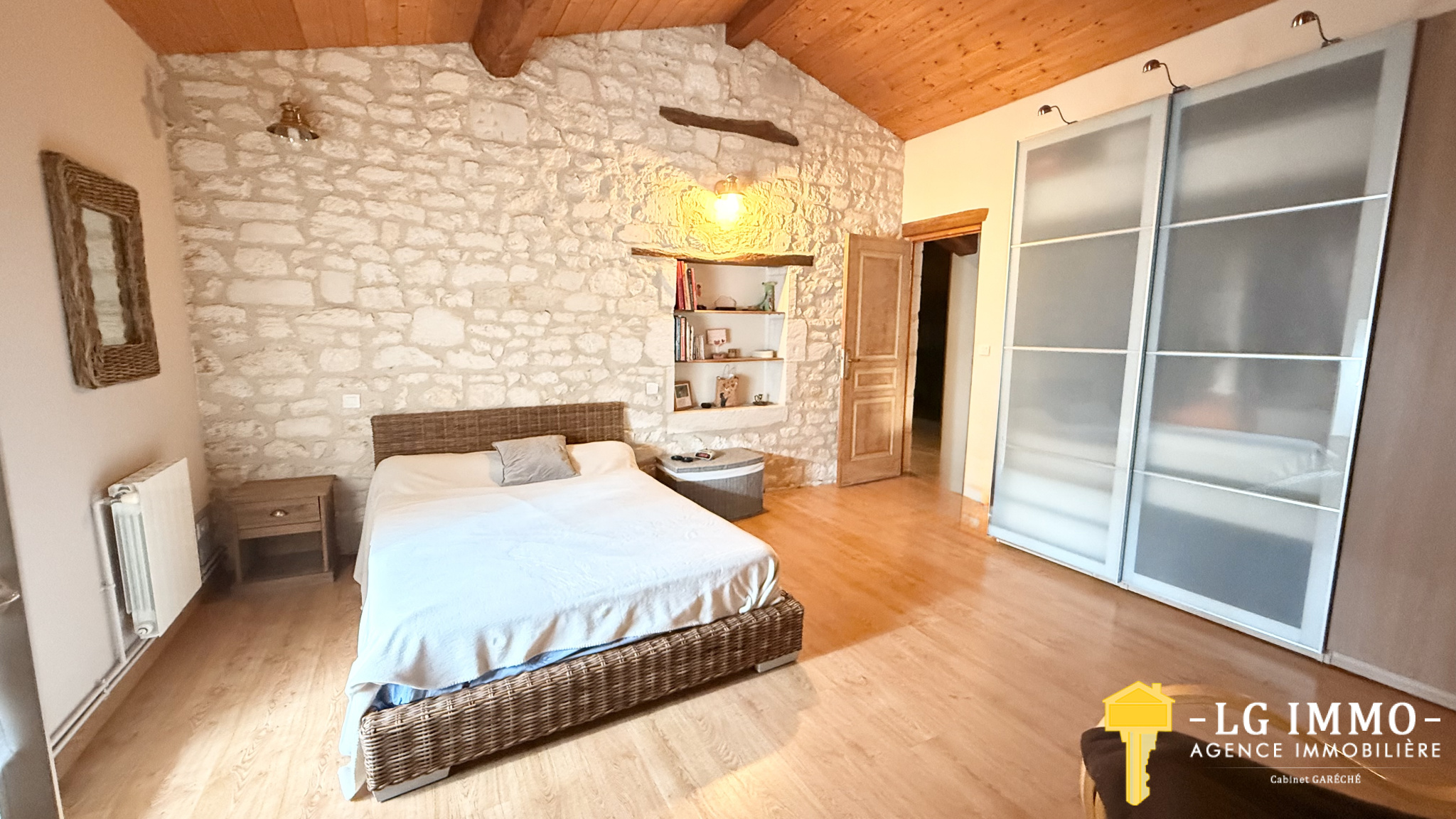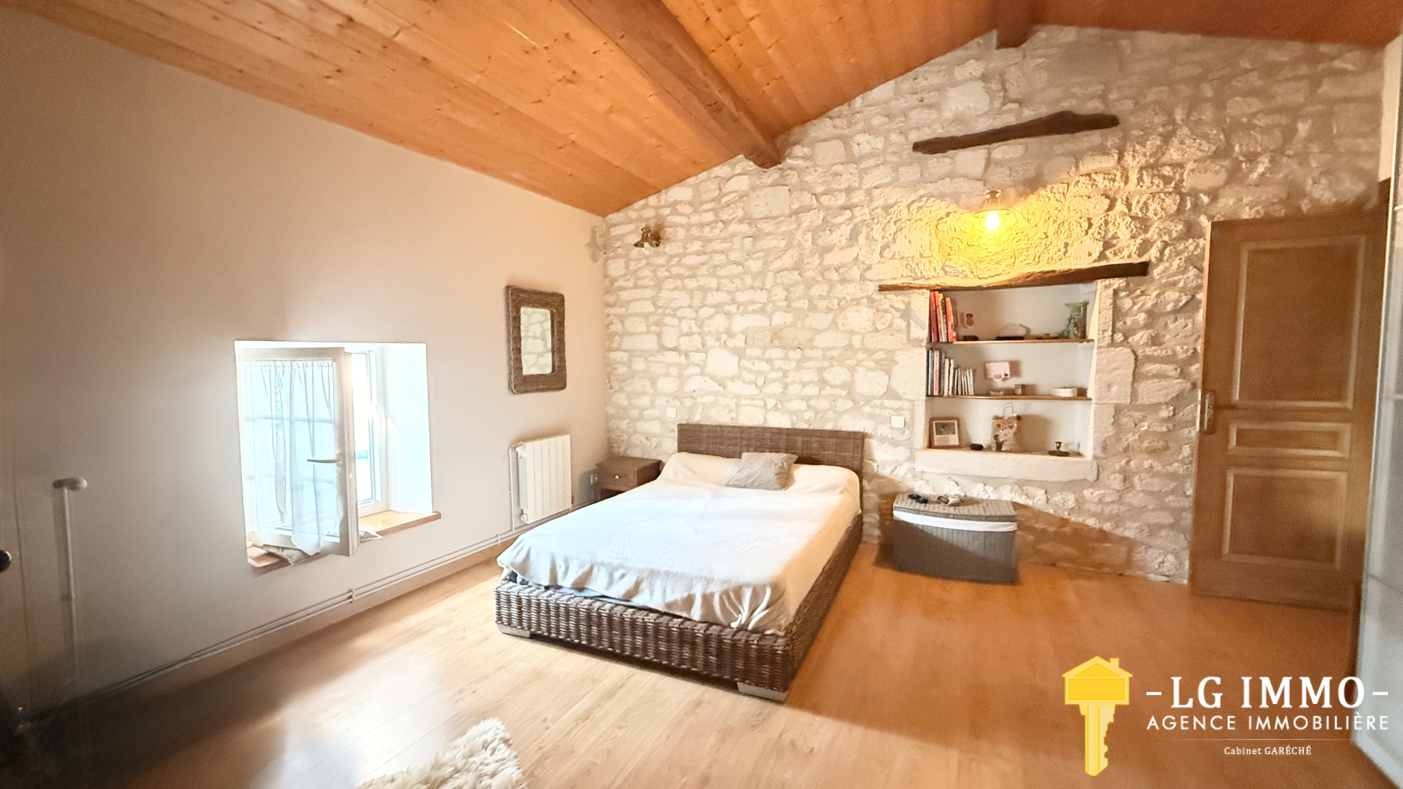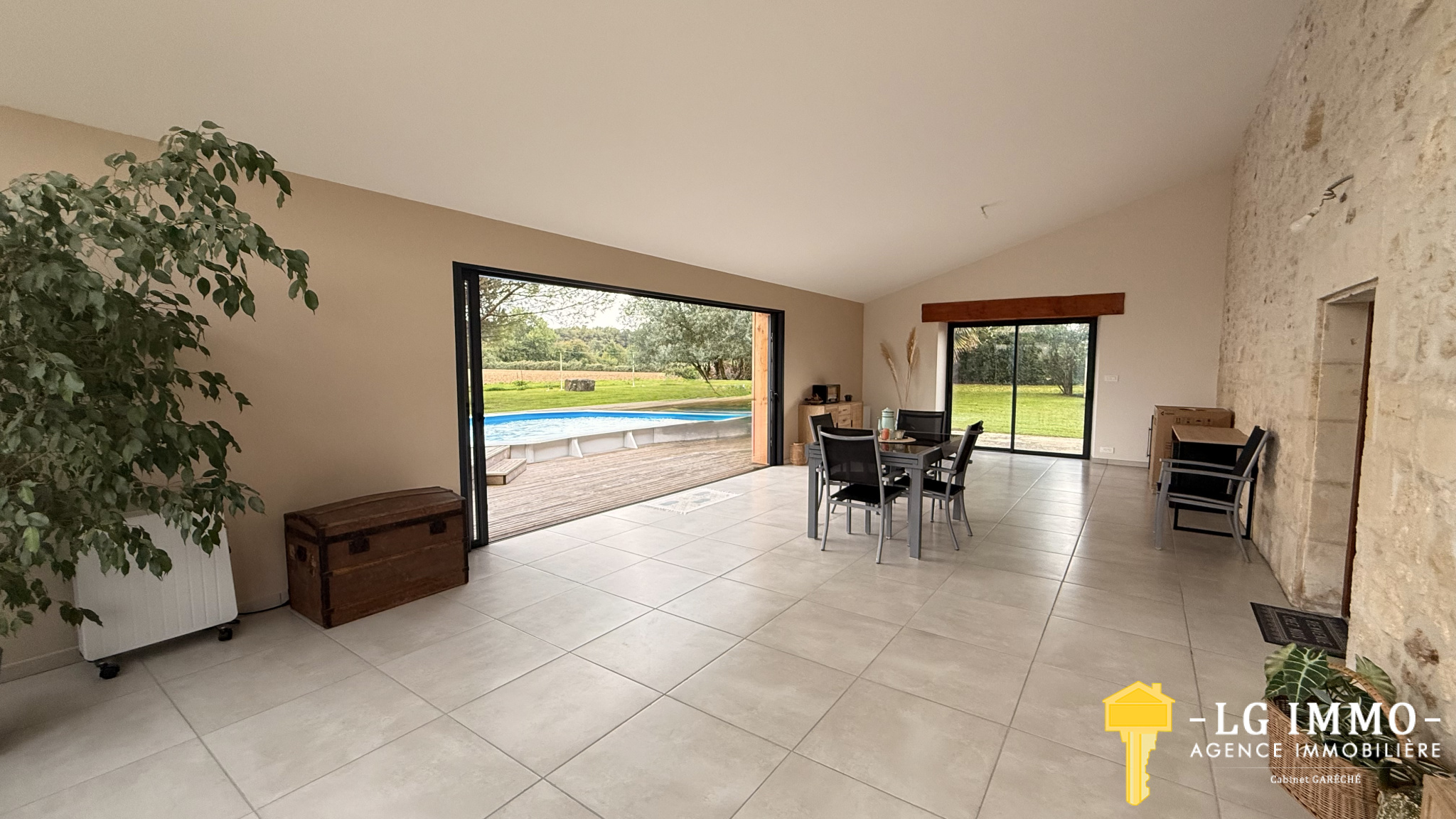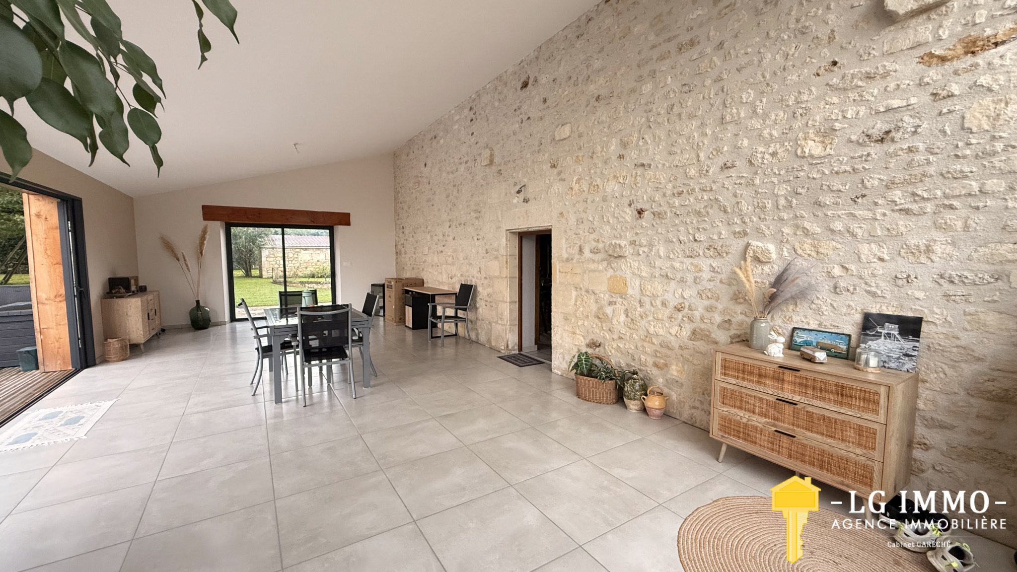 Laissez-vous séduire par le charme de cette authentique maison charentaise en pierre de 220m², idéalement située dans un paisible hameau de Tesson, face à la campagne, tout en bénéficiant de la proximité immédiate des commodités du village. Cette demeure pleine de caractère allie cachet de l’ancien et confort actuel, et se distingue par ses beaux volumes et sa luminosité. Véritable cœur de la maison, une superbe véranda de 47 m² s’ouvre largement sur la piscine avec sa belle baie vitrée à galandage avec 4.5m d'ouverture totale, offrant un espace de vie privilégié où profiter de chaque saison en toute convivialité. vous retrouvez également une cuisine avec cellier de 17m² , une salle à manger de 27m² et un salon cosy avec cheminée de 20m². A l'étage 4 chambres spacieuses de 17 m2, 21 m2,16 m2, et 16.5 m², reste à terminer la salle d'eau. À l’extérieur, le jardin arboré invite à la détente et aux moments partagés en famille ou entre amis. Côté pratique, un vaste garage double avec atelier de 43m² et galetas de 13m² vient compléter les prestations, parfait pour stationner, bricoler ou aménager un espace supplémentaire selon vos envies. Entre charme, confort et fonctionnalité, cette maison constitue une belle opportunité pour ceux qui recherchent la tranquillité de la campagne sans renoncer aux services et commerces de proximité (boulangerie, boucherie, supérette, école, poste, restaurant, pharmacie, cabinet médical, garage, coiffeur...)
