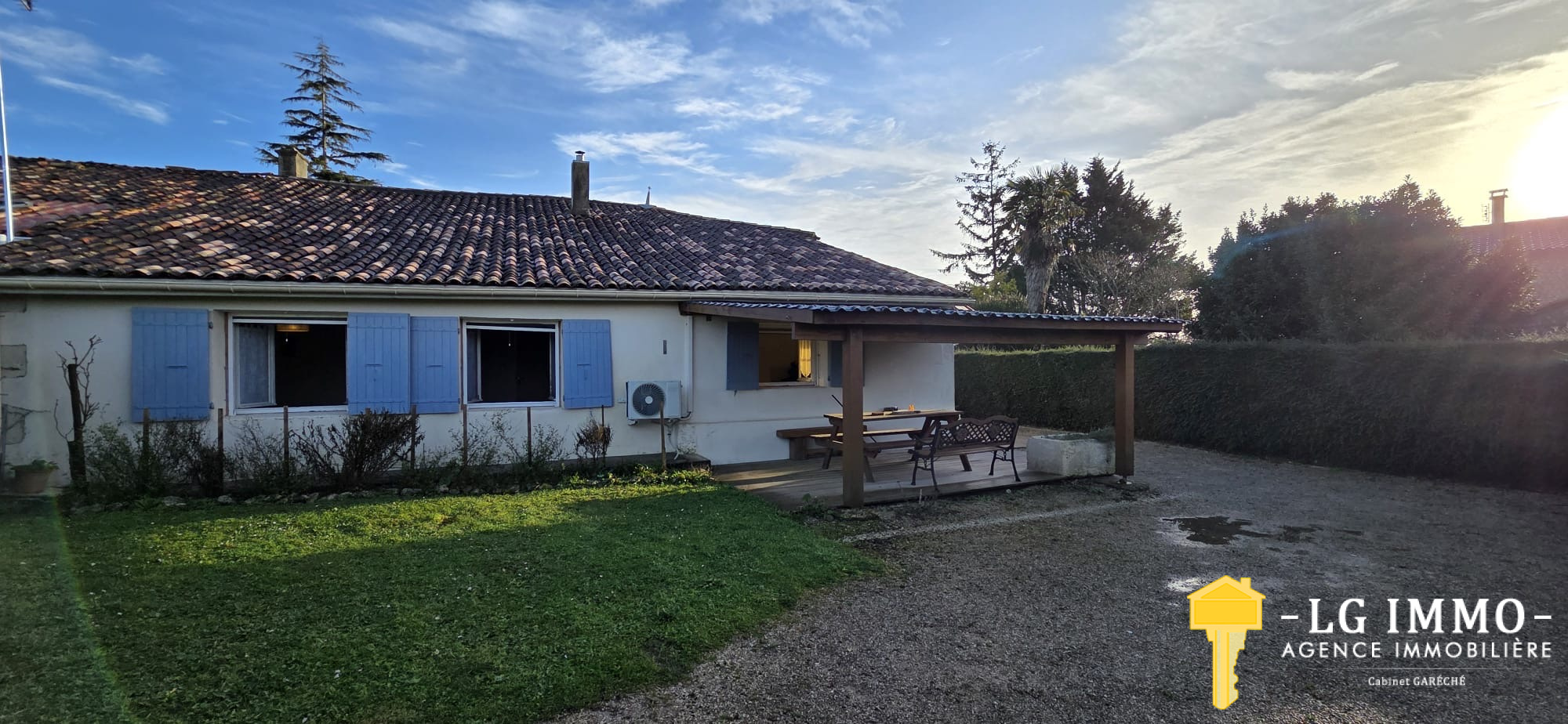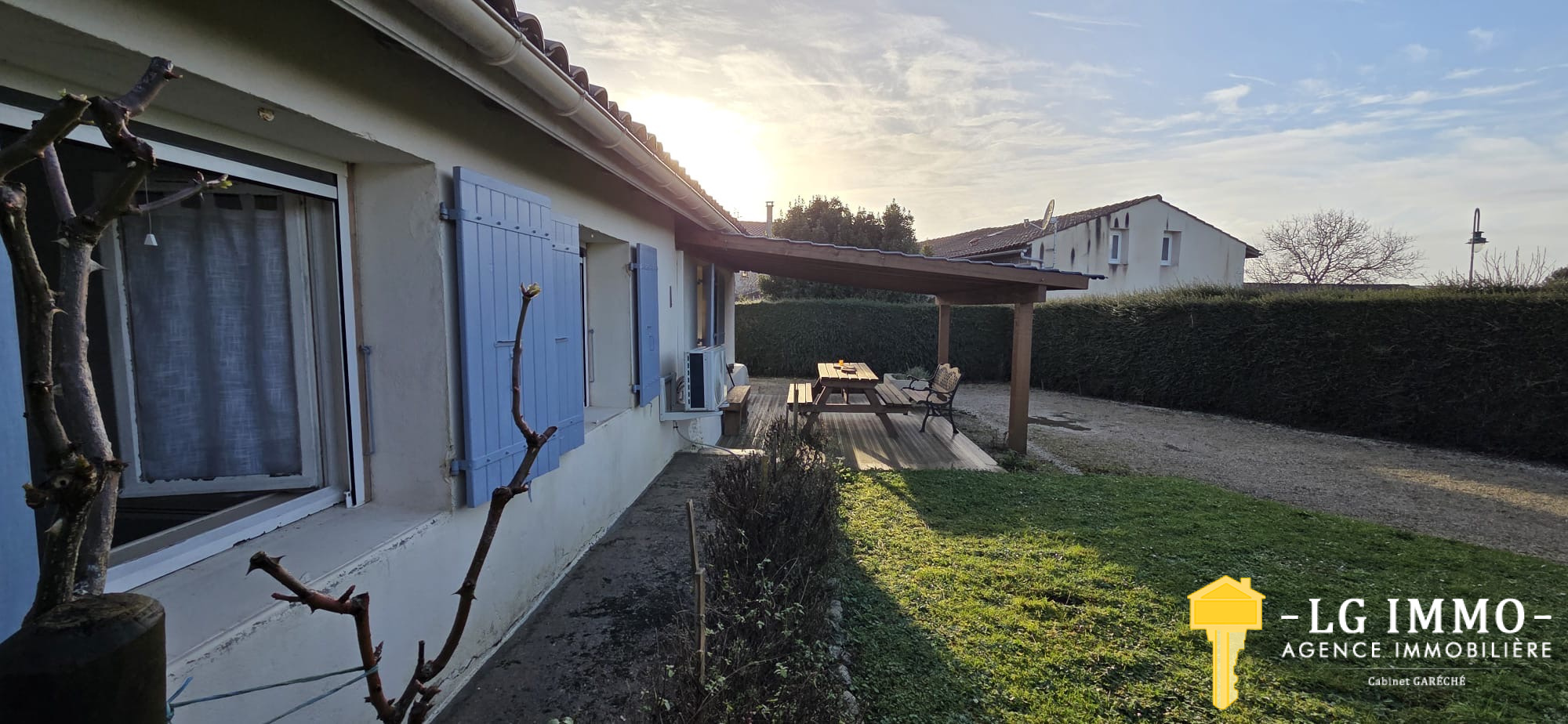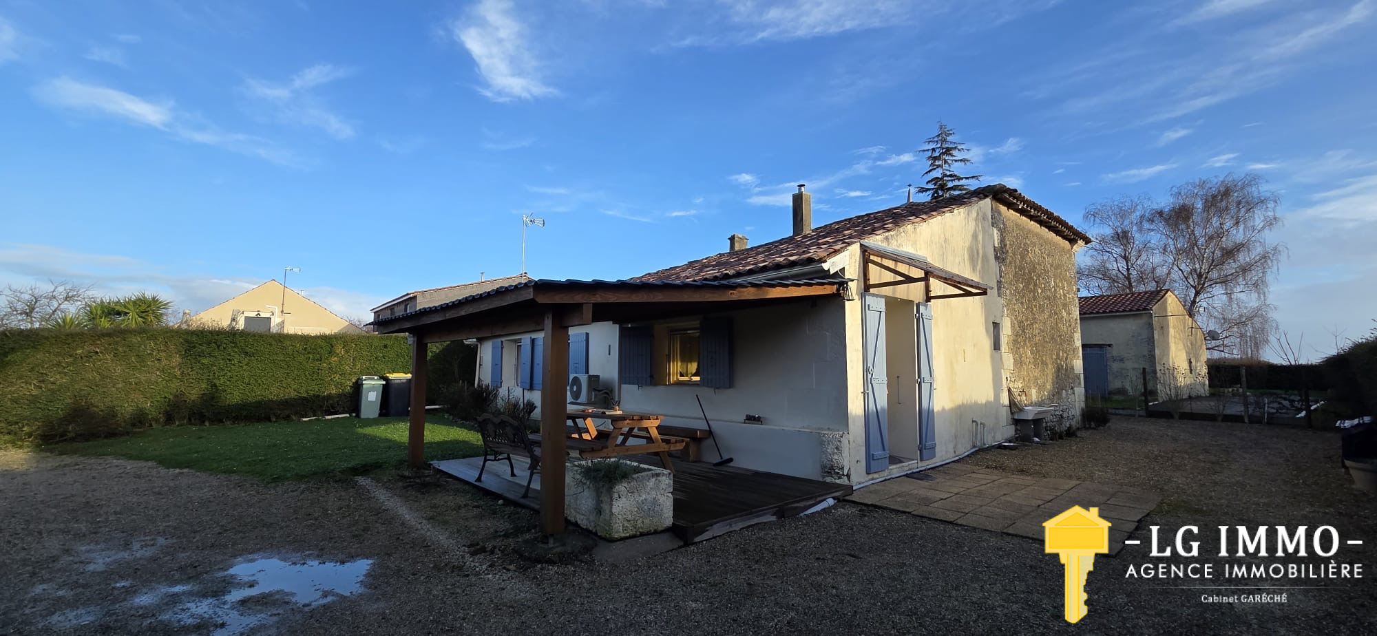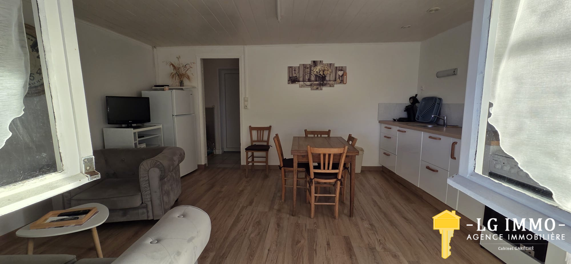 L’agence - LG IMMO - Cabinet Garéché vous propose en exclusivité cette location annuelle non meublée, pour un bail de 3 ans. Cette maison mitoyenne d’un côté, entièrement de plain-pied, d’une superficie d’environ 55 m², se compose d’une pièce de vie avec cuisine de 19,30 m², d’un couloir desservant deux chambres d’environ 11,60 m² chacune, une salle d’eau de 2,90 m² et un WC indépendant. Un grand garage attenant de 56 m² complète le bien. À l’avant de la maison, sur un terrain d’environ 460 m², vous profiterez d’une terrasse en bois couverte de 13,40 m². Le chauffage est assuré par une pompe à chaleur et des convecteurs électriques, et les menuiseries sont en bois double vitrage. Le loyer est de 600 € par mois charges comprises (dont 5 € pour la taxe d’enlèvement des ordures ménagères), le dépôt de garantie s’élève à 595 € et les honoraires d’agence sont de 345,45 €. Pour tout renseignement, contactez votre agence LG IMMO au 05 46 97 27 11 ou par mail à cabinet-gareche@lgimmo.net.