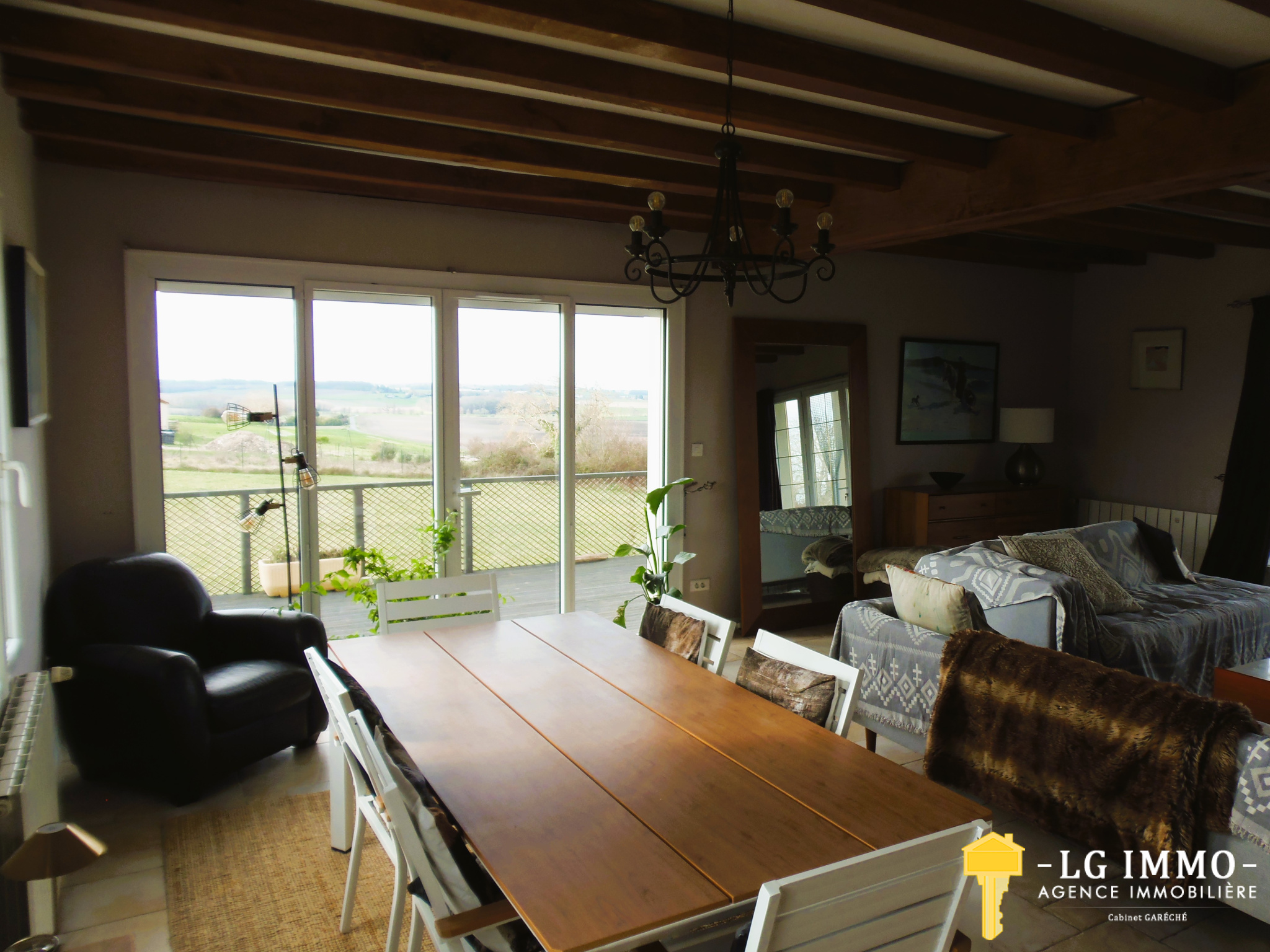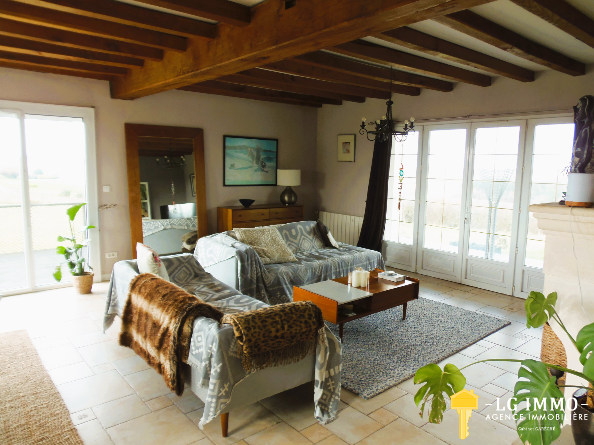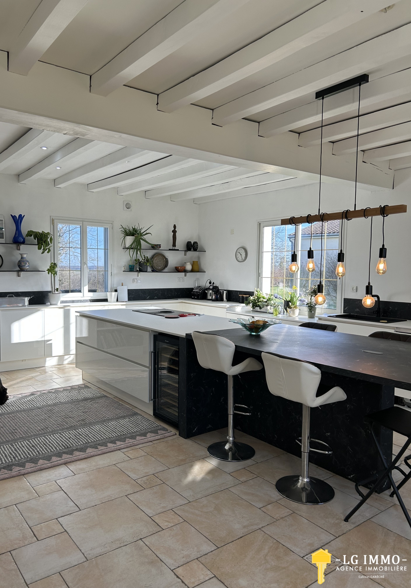 A mois de 10 minutes de Jonzac, cette superbe maison a été finie avec goût et des matériaux de qualité. Dès l'entrée spacieuse, vous accédez à une cuisine moderne et lumineuse de 44m², avec fenêtres sur trois côtés et accès à la terrasse surélevée idéale pour les repas en plein air. Vous pourrez y profiter d'une vue magnifique. La cuisine est équipée d'un beau poêle à bois en céramique et d'une grande table pour recevoir. Une buanderie de 6m² avec WC complète cet espace. Le salon accueillant de 44m², doté de son propre poêle à bois, donne également accès à la terrasse. Le grand palier dessert les 4 chambres. La suite parentale de 23.6m² dispose d'un balcon et d'une salle de douche moderne de 7.3m². Les trois autres chambres font respectivement 20.7m², 18.5m² et 10m², et une deuxième salle de douche moderne est également présente.
