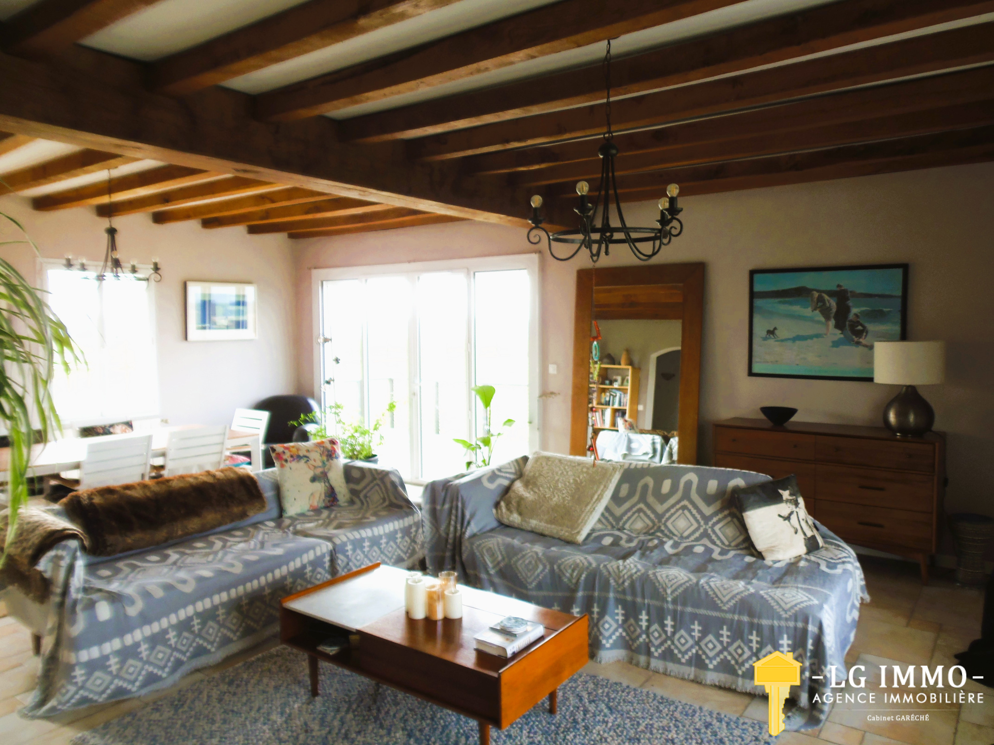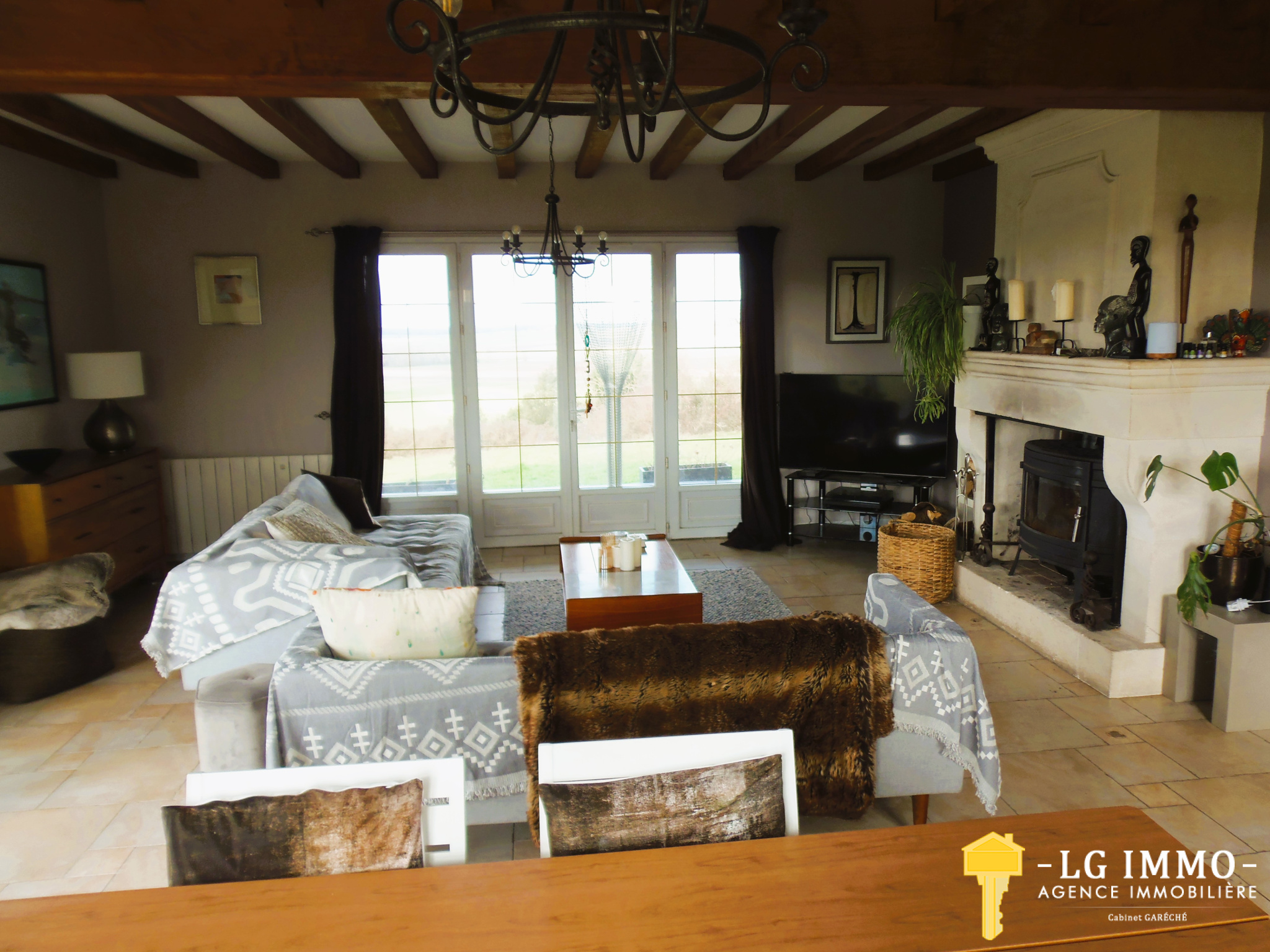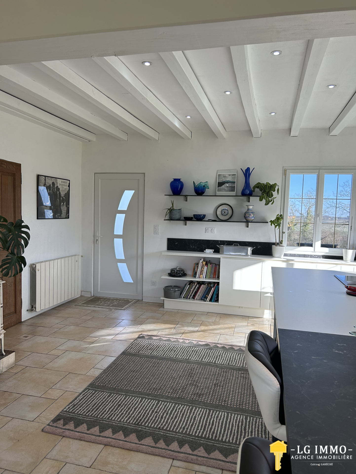 A mois de 10 minutes de Jonzac, cette superbe maison a été finie avec goût et des matériaux de qualité. Dès l'entrée spacieuse, vous accédez à une cuisine moderne et lumineuse de 44m², avec fenêtres sur trois côtés et accès à la terrasse surélevée idéale pour les repas en plein air. Vous pourrez y profiter d'une vue magnifique. La cuisine est équipée d'un beau poêle à bois en céramique et d'une grande table pour recevoir. Une buanderie de 6m² avec WC complète cet espace. Le salon accueillant de 44m², doté de son propre poêle à bois, donne également accès à la terrasse. Le grand palier dessert les 4 chambres. La suite parentale de 23.6m² dispose d'un balcon et d'une salle de douche moderne de 7.3m². Les trois autres chambres font respectivement 20.7m², 18.5m² et 10m², et une deuxième salle de douche moderne est également présente.