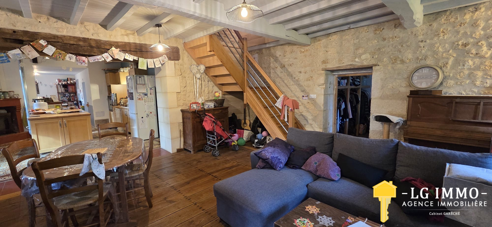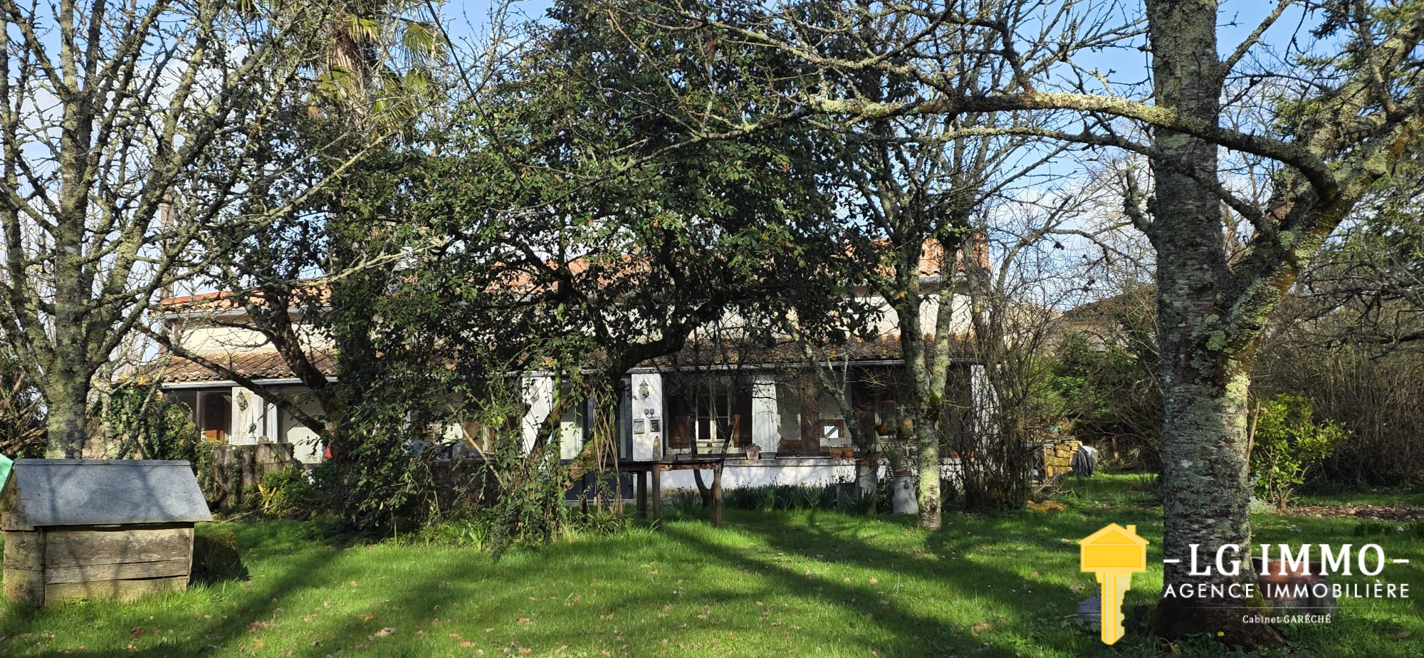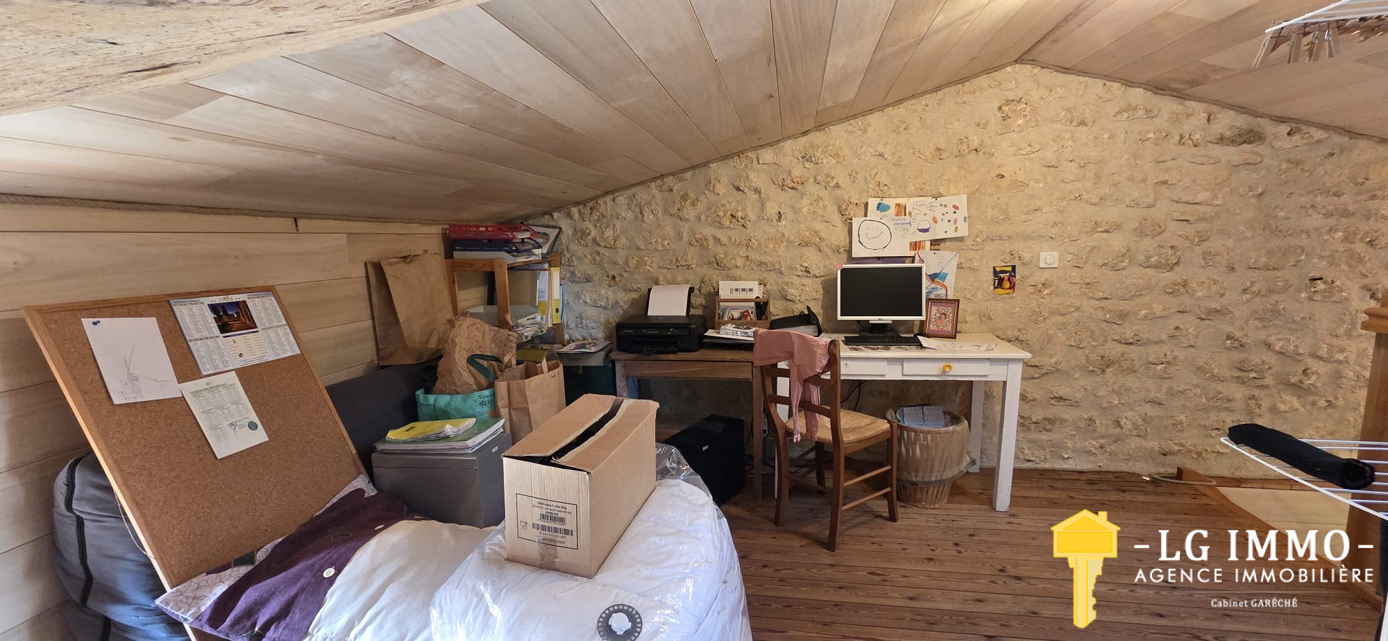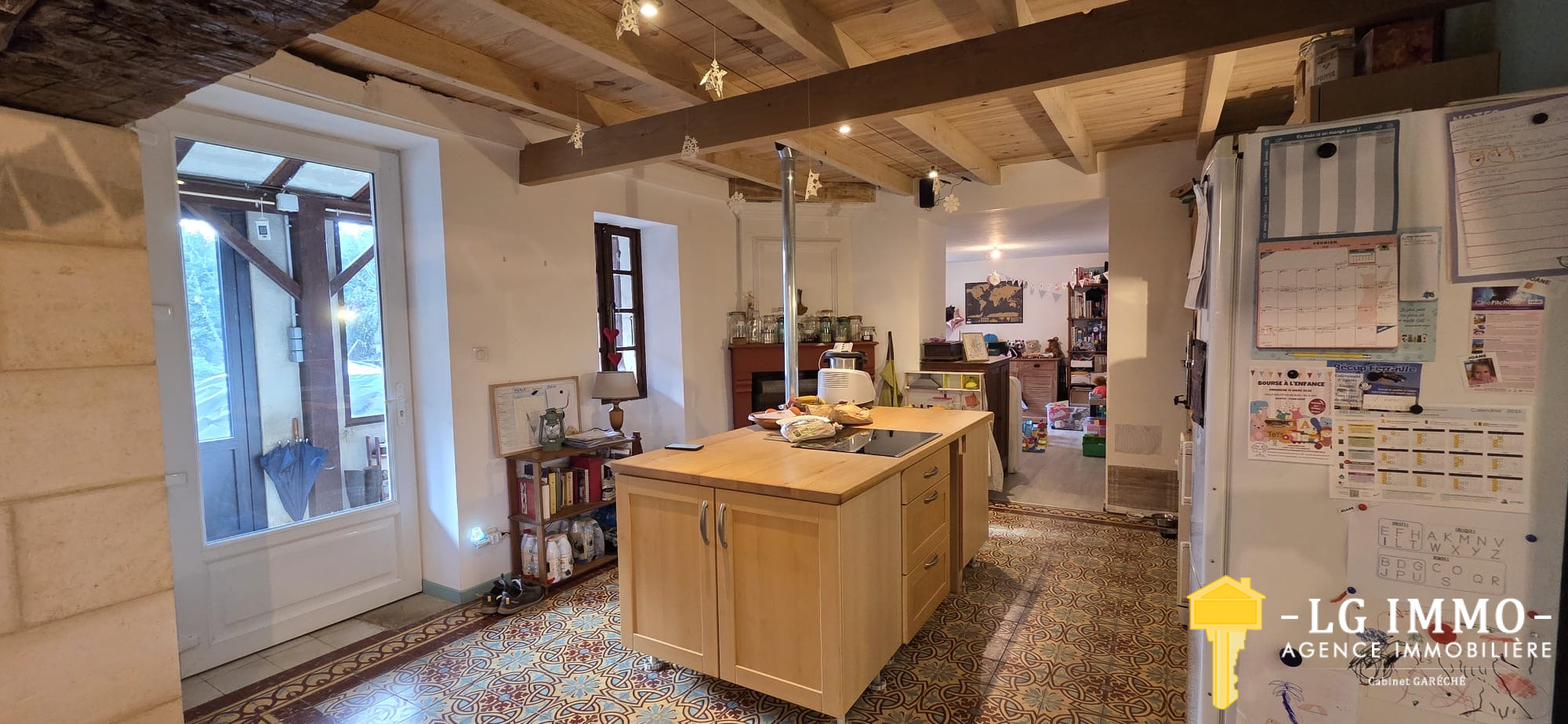 L'agence - LG IMMO - Cabinet Garéché, vous propose d'acquérir cette maison charentaise, située dans la campagne de Champagnolles, au coeur de la nature, à seulement 2kms du bourg et 6 kms de Gémozac et de ses commerces. D'une superficie habitable de 135 m² sur 2 niveaux, elle dispose d'une dépendance attenante de 78 m2 au sol + 45 m2 à l'étage permettant aisément un agrandissement de la maison ou bien la création d'un second logement. Vous entrerez dans la maison part une véranda de 25 m2 servant de vestibule et donnant accès à la pièce de vie de 61 m2 composée d'une cuisine aménagée avec ilôt central, d'un salon/salle à manger où vous sentirez la chaleur dégagée par l'insert et le charme authentique des murs en pierres, et un espace utilisé comme salle de jeux mais laissant libre cour à l'aménagement qui vous convient. Le rez-de-chaussée propose également 2 chambres, une salle d'eau et un WC. À l'étage, un palier de 12 m² en partie mansardé dessert une troisième chambre d'environ 13 m2. Un peu à l'écart de la maison, au bout d'une allée, un hangar de 100 m2 dont 37 m2 fermés complètent l'ensemble (hauteur suffisante pour abriter un camping car par exemple). Les atouts principaux de ce bien sont notamment sa couverture, refaite en 2022 et sa charpente en très bon état, son plancher neuf, la mise en valeur des caractéristiques typiques des maisons charentaises comme les murs en pierres du séjour remis à neuf et la cheminée et son insert totalement refaits, son escalier neuf, l'isolation refaite dans la plupart des pièces... Quant aux travaux nécessaires, il reste quelques ouvertures en bois simple vitrage et un assainissement à prévoir si vous n'êtes pas adeptes des toilettes sèches actuellement en service. Une fosse étanche se situe sous les toilettes et permettrait de les raccorder facilement en incluant une mise aux normes. Si ce bien vous intrigue et si vous recherchez un havre de paix entouré de champs et forêts, n'attendez plus pour contacter votre agence LG IMMO au 05 46 97 27 11 ou à cabinet-gareche@lgimmo.net pour plus d'informations. Pour la vente, l'achat, une estimation, consultez-nous sur les secteurs de Mortagne-sur-Gironde, Cozes, Gémozac, Pons, Saint-Fort-sur-Gironde, Saint-Germain-du-Seudre, Lorignac, Jazennes...